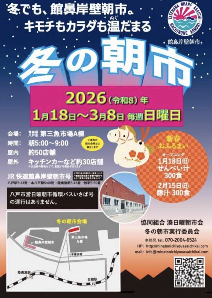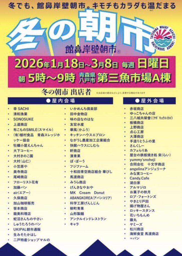 NEWS イベント 2026.01.14 1/18(日)から冬の朝市開催! 八戸「冬の朝市」が今年より移転しました! 冬の朝市2026 1月18日より第三魚市場A棟になります。 館鼻岸壁公認アイドルpacchi(トゥインクル)は2階のフロアーをライブ会場とさせていただく事になりました。毎週7時30分からライブ予定です。 トップ お知らせ一覧